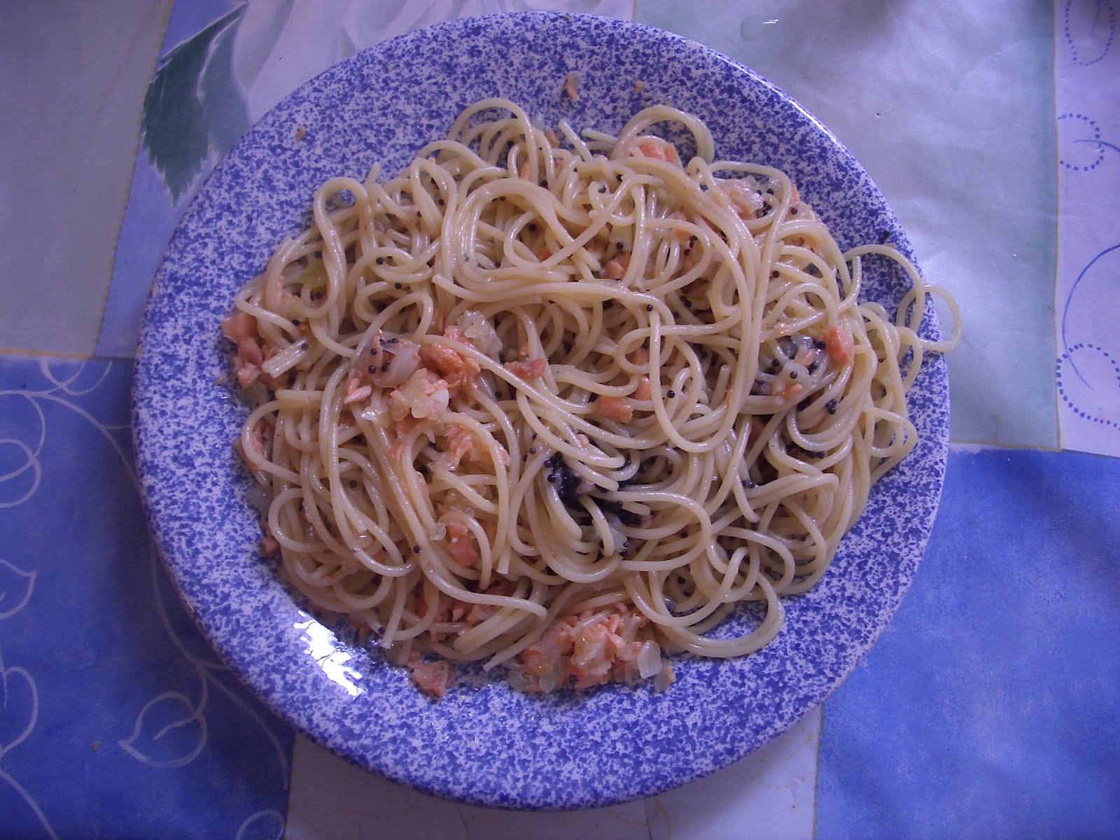 Separately, cook the pasta, drain and add the salmon and onion sauce. Serve on plates and mix 1-2 teaspoons of lumpfish eggs.